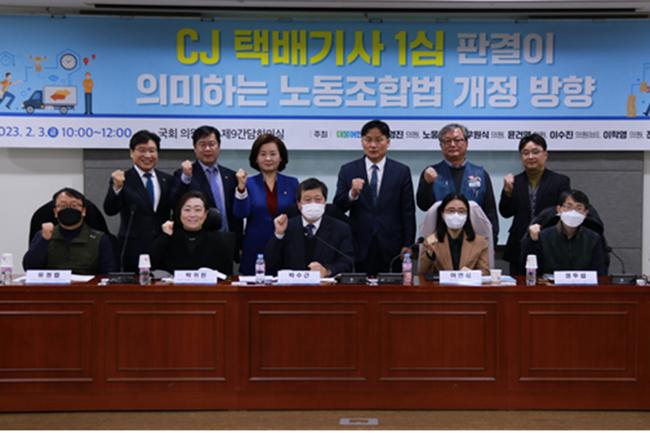 국회 환경노동위원회 더불어민주당 소속 의원들이 주최한 ‘CJ 택배기사 1심 판결이 의미하는 노동조합법 개정 방향’ 토론회가 성황리에 개최됐다 .
