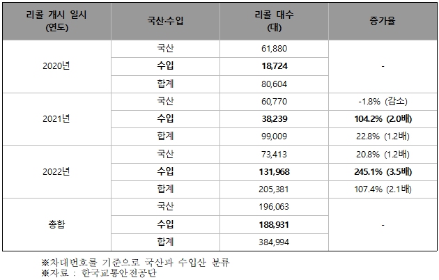 3년간 전기차 수입산은 18만 8,931대, 국산은 19만 6,063대가 리콜됐는데, 수입산의 증가폭이 상당히 컸다. 수입산 리콜대수를 연도별로 보면, △‘20년 1만 8,724대, △‘21년 3만 8,239대, △‘22년 13만 1,968대로 ‘20년~‘21년 사이 2.0배(104.2%), ‘21년~‘22년 사이 3.5배(245.1%)가 증가했다.