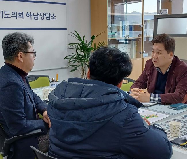 경기도의회 도시환경위원회 김성수 의원은 6일 경기도의회 하남상담소에서 경기주택도시공사(이하 GH) 하남사업단 단장으로부터 하남교산 공공주택지구 (가칭)주민생계조합 협의 추진현황을 보고받고 주요 현안을 논의하는 자리를 가졌다.