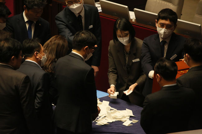 8일 국회 본회의에서 이상민 행정안전부 장관에 대한 탄핵소추안 투표 후 국회 직원들이 검표하고 있다.
