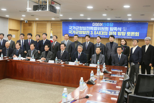 8일 오후 국회 의원회관 제2세미나실에서 열린 `국가균형발전특별위원회 발족식 및 국가균형발전 3.0시대의 정책 방향 토론회`에서는 이재명 더불어민주당 당대표의 축사, 송재호 위원장 환영사, 도종환 상임고문의 축사, 세종 지역 국회의원 강준현 의원의 출범 발족문 낭독사 순으로 진행됐다.