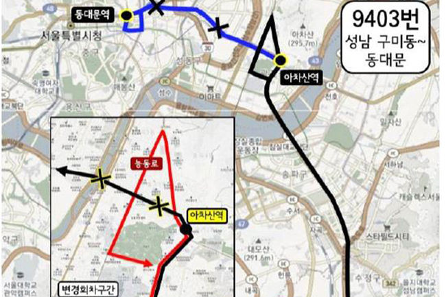 구는 주민 의견조회 등의 절차를 거쳐, 결국 9403번이 중곡역 일대를 지나도록 노선을 조정하는 데 성공했다. 변경된 노선에 따라 기존 동대문역사문화공원역 방면으로 운행하지 않는 대신 중곡역 일대를 경유한다.