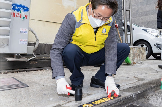 담배공초 무단투기 금지 스티커를 부착하는 최호권 영등포구청장 모습(사진=영등포구청 제공)