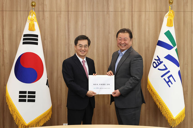 김경일 파주시장은 13일 경기도청에서 김동연 경기도지사를 만나 파주시 주요 현안을 논의하며 ‘시내버스 준공영제 전환’ 관련 경기도의 지원을 요청하는 건의서를 전달했다.
