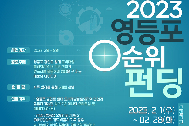 영등포구가 청년 창업자의 참신한 아이디어와 경인로 일대 산업 인프라 간의 협업을 지원하는 `2023 영등포 0순위 펀딩`을 진행한다고 밝혔다.