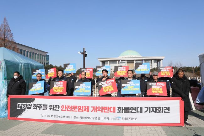 민주노총 공공운수노주 화물연대본부(이하 화물연대)는 15일 서울 여의도 국회 앞에서 대기업 화주를 위한 안전운임제 계약 반대 기자회견을 하고 있다.민주노총 공공운수노주 화물연대본부(이하 화물연대)는 15일 서울 여의도 국회 앞에서 대기업 화주를 위한 안전운임제 계약 반대 기자회견을 열어 "대기업 화주만을 위한 안전운임제 폐지 법안을 거부한다"라며 이같이 밝혔다.