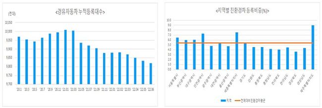 경유자동차 누적 등록대수(왼쪽), 지역별 친환경차 등록비중(오른쪽)