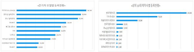 지역별로는 경기·서울·제주도에 전기차(132,216대)가 다수 등록(44.3%)된 것으로 나타났다. 차종별로는 승용 77.9%(232천대), 화물 20.7%(62천대), 승합 1.3%(4천대), 특수 0.1%(143대) 등록되었다. 제작사별로는 현대(43.8%), 기아(25.6%), 테슬라(13.3%) 순으로 누적 등록 점유율 순이었다.