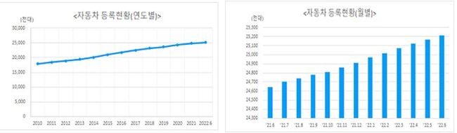 국토교통부는 ‘22년 2분기 자동차 누적등록 대수는 25,215천대로 전분기 대비 0.6%인 145천대 증가하였으며, 인구 2.05명당 1대의 자동차를 보유하였다고 밝혔다.