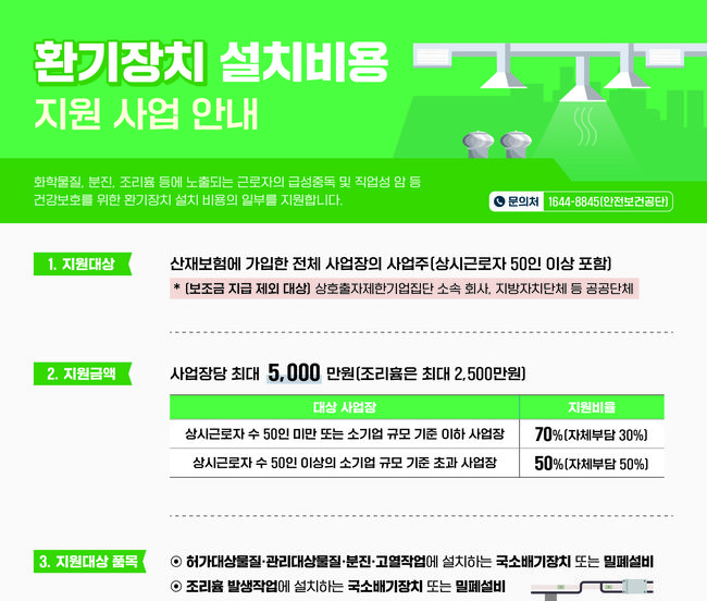 환기장치 설치비용을 지원받기를 원하는 사업장은 2월 17일부터 가까운 한국산업안전보건공단 광역본부.지역본부.지사에 방문 또는 우편으로 접수·신청할 수 있으며, 자세한 사항은 공단 누리집에서 확인하거나로 문의하면 된다.
