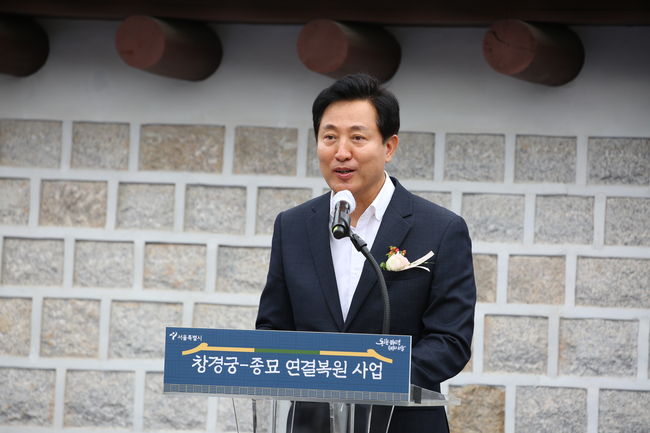 21일 서울 창경궁-종묘 연결 역사복원 시민개방 행사에서 오세훈 서울시장이 인사말을 하고 있다.이번 역사복원사업은 과거 동궐(창덕궁‧창경궁)과 유기적으로 연결돼 있었지만 일제가 율곡로를 개설하면서 섬처럼 분리돼 버린 종묘를 선조들이 계획하고 건설했던 공간으로 되돌렸다는 데 의미가 있다.