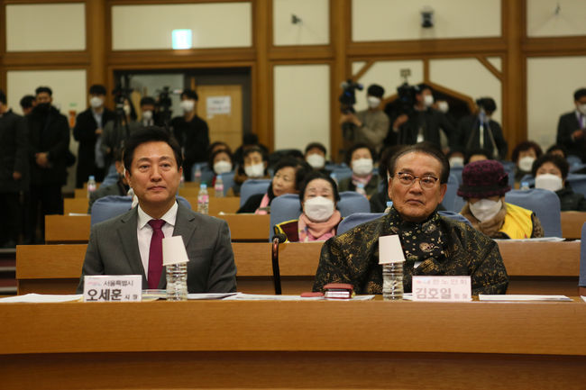 오세훈 서울시장과 김호일 대한노인회장이 16일 국회의원회관 제1소회의실에서 열린 `도시철도 노인 무임수송 정책토론회`에 참석했다.