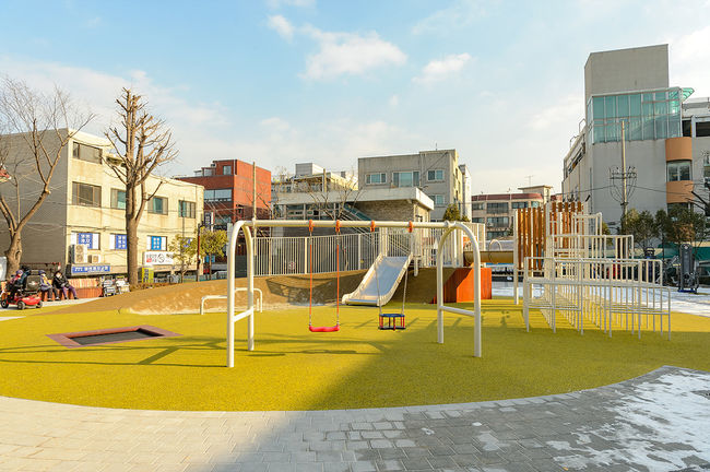 신월7동 아동어린이공원도 인근에 약수시장과 주택가가 있어 시장상인을 비롯해 주민들이 많이 찾는 공간이다. 양천구는 이곳에 ‘유니버설디자인’ 공모로 당선된 작품인 ‘놀이: 테’의 디자인을 적용해 ‘동행’을 테마로 새롭게 재정비했다.