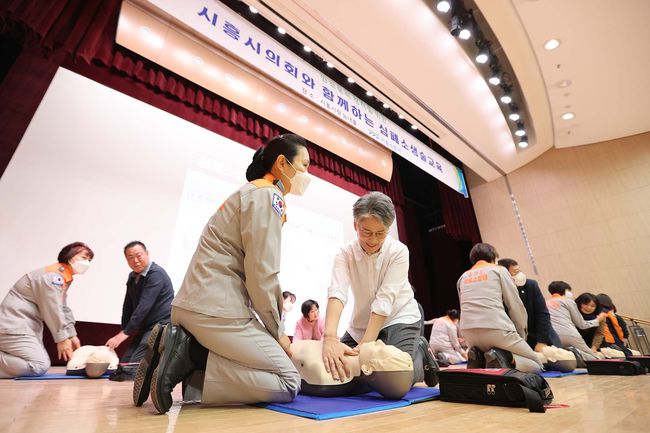 심폐소생술 교육 (사진제공=시흥시의회)이날 시의회는 이태원 참사 이후 심폐소생술의 중요성이 강조됨에 따라 응급상황 발생 시 신속한 대처를 위해 이론교육과 심폐소생술(CPR) 요령, 자동심장충격기(AED) 사용법 등을 직접 실습해보는 시간을 가졌다.