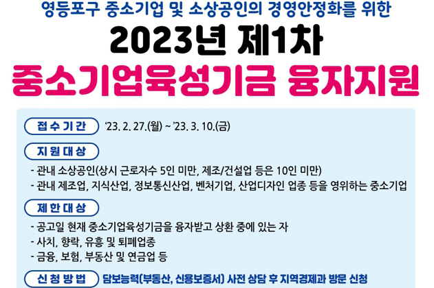 영등포구, 중소기업·소상공인 숨통 트이게…저금리 60억 융자 지원 - 올해 1.5% 저금리로 중소기업·소상공인 등 60억 융자 지원 - 2월 27일-3월 10일 상반기 30억 융자 지원 신청 접수, 소상공인 최대 2억 융자 - 소상공인·지역경제 활성 위해 다양한 정책 실시 예정