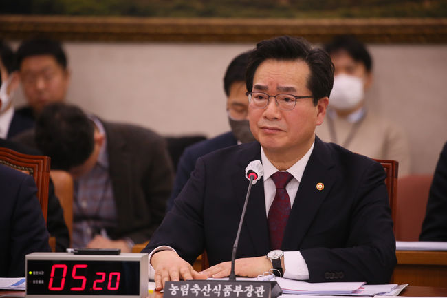 오늘 20일 국회에서 열린 농림축산식품해양수산위원회 전체회의에서 정황근 농립축산식품부 장관이 의원들이 질의에 답변하고 있다.