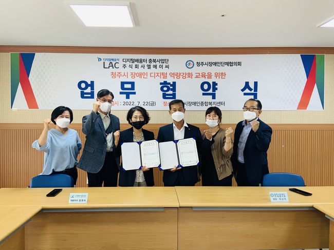 청주시장애인단체협의회는 청주시장애인복지센터에서 디지털배움터 충북사업단 주식회사 엘에이씨와 지난 22일에 ‘청주시 장애인 디지털 역량강화 교육을 위한 업무협약’을 체결했다.