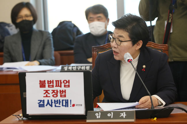 21일 국회에서 열린 환노위 전체회의에 환노위 간사 국민의힘 임이자 의원은 "저도 노동운동 했던 사람으로서 노동자를 사랑하는 마음이 왜 없겠나. 노동자가 잘 먹고 잘 사는 나라로 만들고 싶다"며 "지금 현재 자원도 없는 나라에서 국가 경쟁력을 키워야 한다. 그런 속에서 현재 노조법 만으로도 충분히 노동자 보호 3권 보장이 다 된다"고 지적했다.