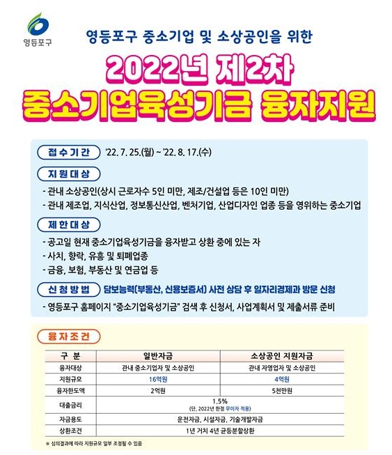 영등포구, 중소기업육성기금 융자지원 실시 - 2022년 한정 융자금리 무이자 실시…지원규모 20억 원 - 1년 거치 4년간 균등분할상환 조건…업체당 최대 2억 원까지 지원 - 담보 여력 확인 후, 7월25일부터 8월17일까지 구청 방문 신청