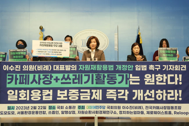 이수진 `자원재활용법 개정안` 발의..."일회용컵 보증금제도 합리적·효과적 개선·시행돼야" - 22일 오전 국회 소통관서 `자원재활용법 개정안` 발의 기자회견 열려 - 이 의원"일회용컵 보증금 제도, 자원순환정책의 핵심" - "윤 정부, 시행일 무단 연기·시행지역 축소해 제대로 시행 안되고 있어" 비판