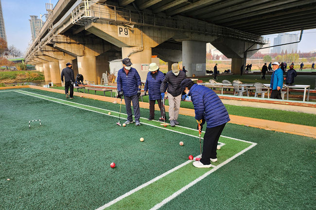 구민들이 오목교 게이트볼장에서 게이트볼을 치고 있는 모습(사진=영등포구청 제공)