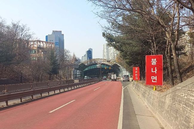 경기도 소방재난본부는 지난 3일 용인시 수지구 포은대로에 있는 방음터널 입구에 눈에 확 띄는 빨간색 바탕에 흰색 글씨로 ‘불나면 대피 먼저’가 적힌 화재 대피 안내표지판을 시범 설치했다.