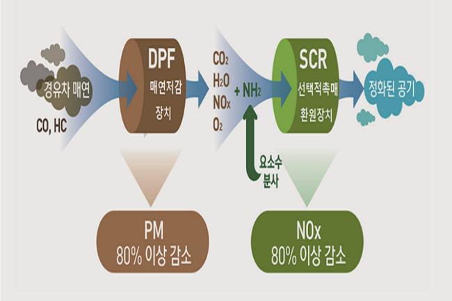 자동차 배출가스 저감장치는 경유가 불완전 연소해 발생하는 유해물질을 필터로 걸러낸 뒤 고온으로 태워 오염물질을 제거하는 원리로, 입자상 물질(PM)을 80% 이상 저감하는 효과가 있다. 이러한 저감장치를 부착한 차량은 노후경유차 운행제한 단속 대상에서 제외되며, 저감장치 부착 후 성능유지확인검사에 합격하면 자동차 배출가스 검사와 환경개선부담금을 3년간 면제받을 수 있다.
