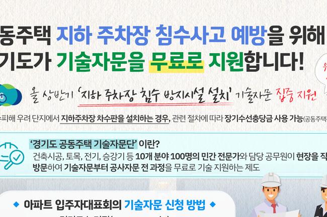 경기도가 공동주택에서 지하 주차장 내 침수 방지시설을 원활히 설치할 수 있도록 ‘경기도 공동주택 기술자문단’이 전문적인 기술지원을 무료로 지원한다며, 신청을 독려했다.