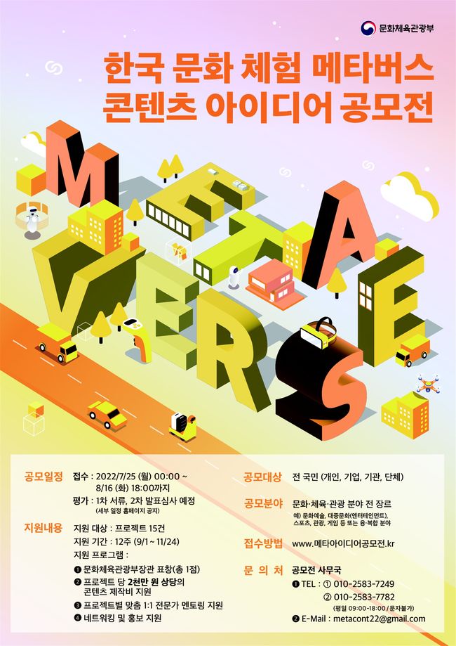 문화체육관광부(이하 문체부)는 전 세계인들이 확장 가상세계(메타버스)에서 우리 문화를 체험하고 즐길 수 있도록 7월 25일부터 8월 16일까지 관련 콘텐츠 개발 아이디어와 창·제작 협업사례를 공모하고 총 18개 과제를 선정한다. 선정된 과제는 확장 가상세계 콘텐츠로 제작될 수 있도록 비용 등을 지원할 계획이다.