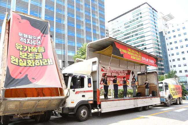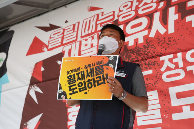 민주노총은 25일 서울 강남구 역삼동 GS칼텍스 본사 앞에서 기자회견을 열고 재벌 정유사들이 유가폭등을 틈타 폭리를 취하고 있다며 정부에 ‘횡재세’ 도입을 촉구했다.