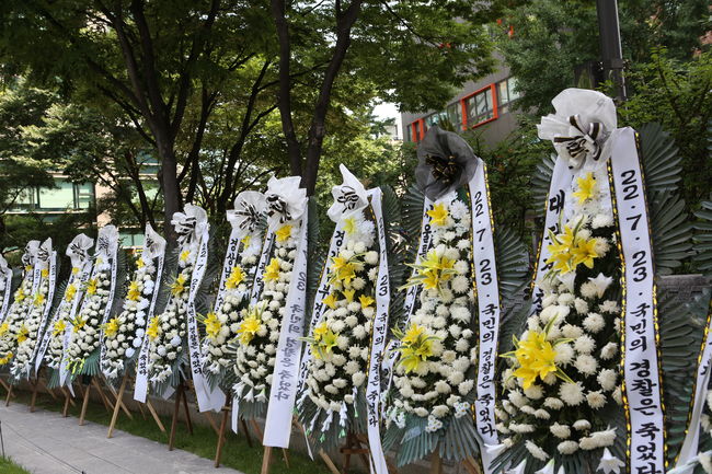 국가공무원노동조합 경찰청지부와 경찰청주무관노동조합은 26일 서울 서대문구 경찰청 앞에서 류삼영 총경의 대기발령 철회 및 회의 참석 총경들에 대한 감찰 조사 중단을 촉구하며 구호를 외쳤다.이날 전국 일선 경찰들은 경찰청 인근에 “국민의 경찰은 죽었다”고 적힌 근조 화환 등을 보내며 강하게 반발했다. 이날 ‘이 경위’ ‘김 경사’ 등 익명으로 전국 경찰관들이 보낸 근조 화환은 약 40개에 달했다.