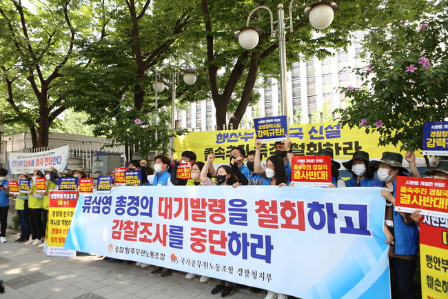 국가공무원노동조합 경찰청지부와 경찰청주무관노동조합은 26일 서울 서대문구 경찰청 앞에서 류삼영 총경의 대기발령 철회 및 회의 참석 총경들에 대한 감찰 조사 중단을 촉구하며 구호를 외쳤다.