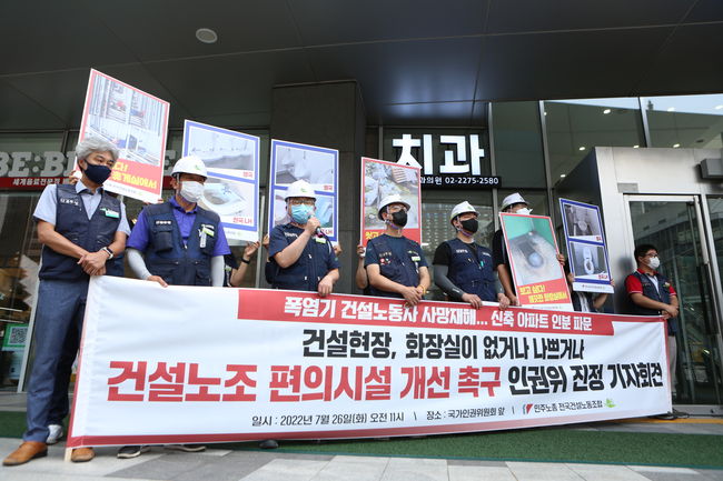민주노총 전국건설노동조합(건설노조)은 26일 서울 중구 국가인권위원회 건물 앞에서 ‘건설노조 편의시설 개선 촉구 인권위 진정 기자회견’을 열고 “인간답게 일(용변) 보게 해달라”고 촉구했다.