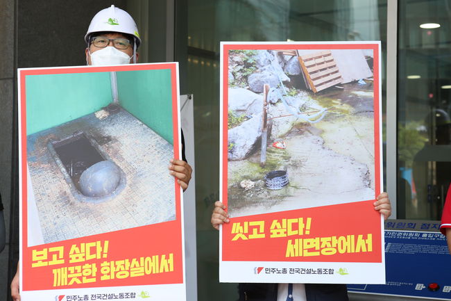 건설노조는 `우리도 인간답게 용변을 볼 수 있게 해달라`고 호소했다.강한수 건설노조 노동안전보건위원장은 최근 경기도 화성시 한 신축 아파트 천장에서 인분이 나온 사건도 언급했다. 강 위원장은 “노동자들이 건물 내부에서 용변을 보는 것은 잘못된 일”이라 사과하면서도 “건설 현장엔 화장실이 턱없이 부족하고 멀리 떨어져 있는 경우가 많다”고 설명했다.
