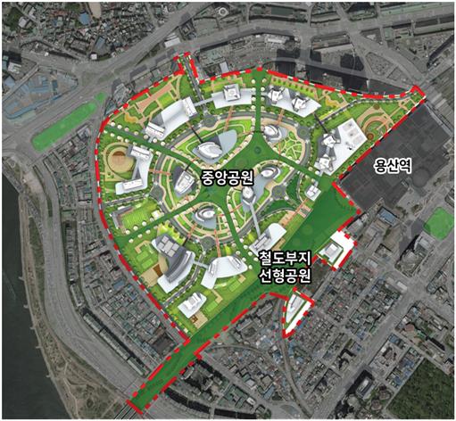 용산국제업무지구에서 용산공원, 한강으로 뻗어나가는 방사형 녹지체계를 구축한다. 지구 중앙에는 어디서나 손쉽게 접근할 수 있는 대규모 중앙공원을 조성하고, 철도부지에는 선형공원을 조성한다.