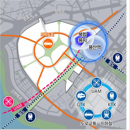 강변북로, 한강대로, 청파로 등 주요 간선도로와 직접 연결되는 지하도로를 개설해 서울도심‧강남, 인천공항으로의 광역 접근성을 확보한다. 용산역과 인접한 부지에는 미래항공교통(UAM), GTX, 지하철, 도로 교통 간 쉽고 편리하게 환승할 수 있는 대중교통환승거점인 1호 ‘모빌리티 허브’를 조성한다.