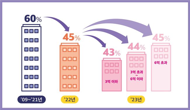 올해 공동주택의 공시가격(시세 × 현실화율)이 전년 대비 18.63% 하락해 공정시장가액비율을 전년과 동일하게(45%) 적용할 경우에도 세부담이 줄어드나, 서민 주거 안정 지원을 위해 공시가격 6억* 이하 주택에 대해 공정시장가액비율을 추가 인하키로 한 것이다.