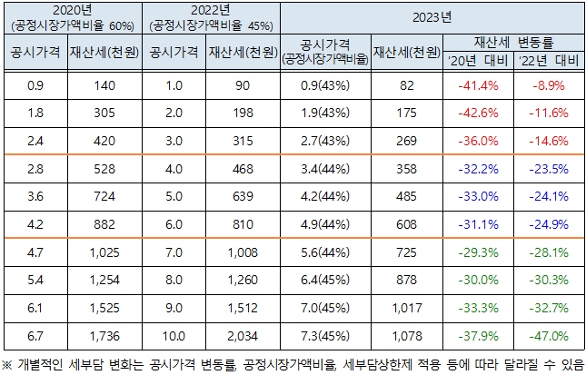 2023년 1주택자 공정시장가액비율을 43~45%로 설정함에 따라 납세자 세부담(’22년 공시가격 1~10억 기준)은 2020년 대비 29.3%~42.6% 감소할 것으로 예상되며, 2022년 대비 8.9~47% 감소할 것으로 예상된다.