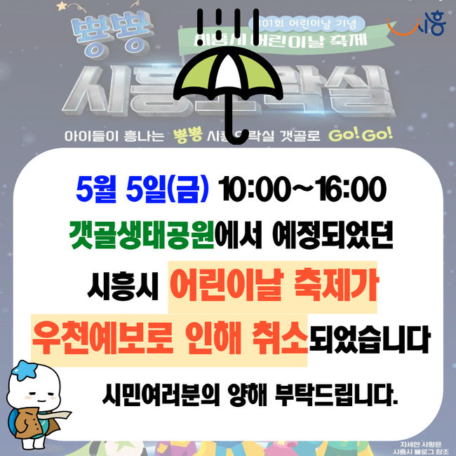 시흥시가 오는 5일 제101회 어린이날을 맞아 갯골생태공원에서 개최하기로 한 ‘뿅뿅 시흥오락실’ 행사를 우천 예보로 취소하기로 결정했다고 밝혔다.