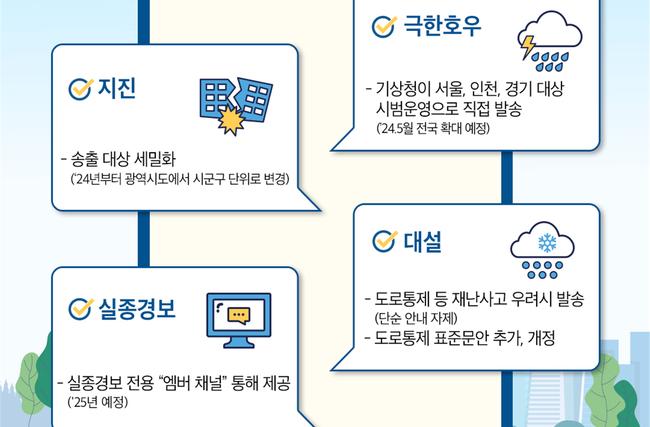 이를 위해, 행정안전부에서는 『재난문자방송 기준 및 운영규정』을 4월말 개정하였고, 올해 6월 15일부터 서울, 인천, 경기 등 수도권을 대상으로 시범운영하고 내년 5월부터 전국으로 확대할 계획이다.
