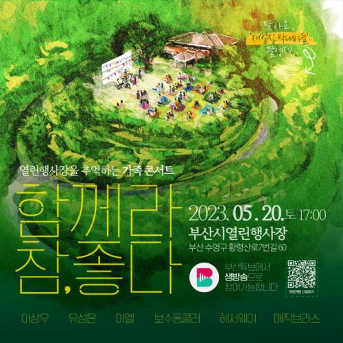 부산시는 오는 5월 20일 오후 5시 부산시 열린행사장 잔디밭에서 시민초청 가족 콘서트 ‘함께라 참, 좋다‘를 개최하고, 오는 12일까지 현장 관람객을 모집한다고 밝혔다.