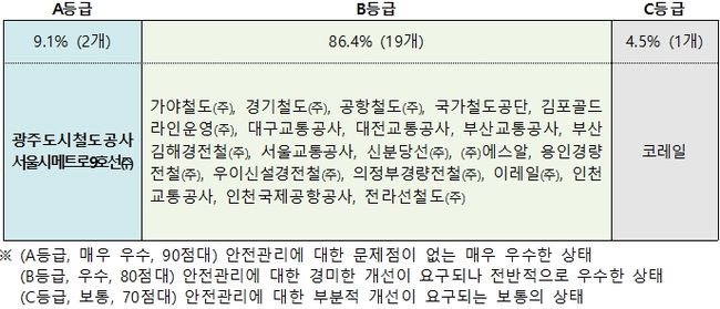 A등급을 받은 광주도시철도공사(최우수), (주)서울시메트로9호선(우수)은 우수운영자로 지정(인증서 수여, 5.12)되며, 코레일은 지난해 철도사고 및 사상자 증가의 영향으로 22개 기관 중 유일하게 C등급을 받았다.