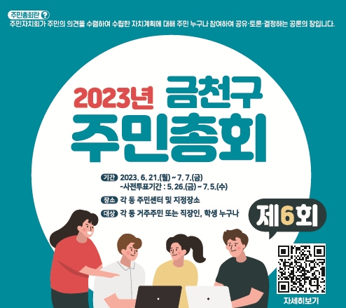 금천구, 우리동네 공론의 장 ‘주민총회’ 개최 - 주민 누구나 참여해 공유·토론·결정하는 마을 민주주의의 장 - 6월 21일부터 7월 7일까지 동별 자치계획 결정 - 현장 참여가 어려운 주민들을 위해 온·오프라인 사전투표 실시