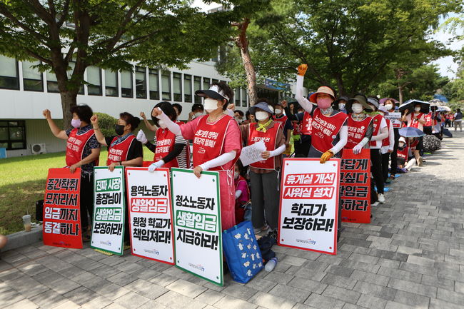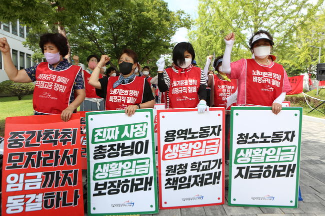 민주노총 공공운수노조 서울지역공공서비스지부는 27일 연세대학교 백양관에서 `대학사업장 집단교섭 투쟁 결의대회`를 열고 대학 청소노동자의 임금 인상 등 처우개선을 요구하고 나섰다.결의대회 참가자들은 원청인 대학이 직접 문제 해결에 나설 것을 촉구하면서 "대학은 코로나 핑계로 저임금을 받고 있는 용역노동자들의 희생을 강요하고 있다"며 "원청인 학교가 문제를 하루빨리 해결해야 한다"고 밝혔다.