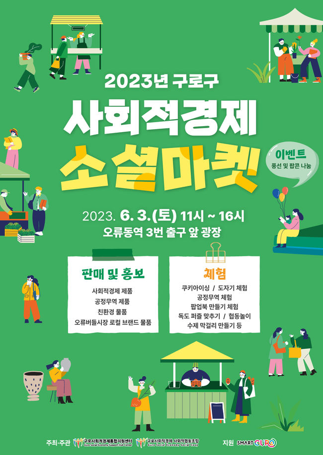 구로구는 6월 3일 오전 11시부터 오후 4시까지 오류동역 광장(3번 출구)에서 사회적경제 활성화를 위한 ‘2023년 구로구 사회적경제 소셜마켓’이 열린다고 밝혔다.