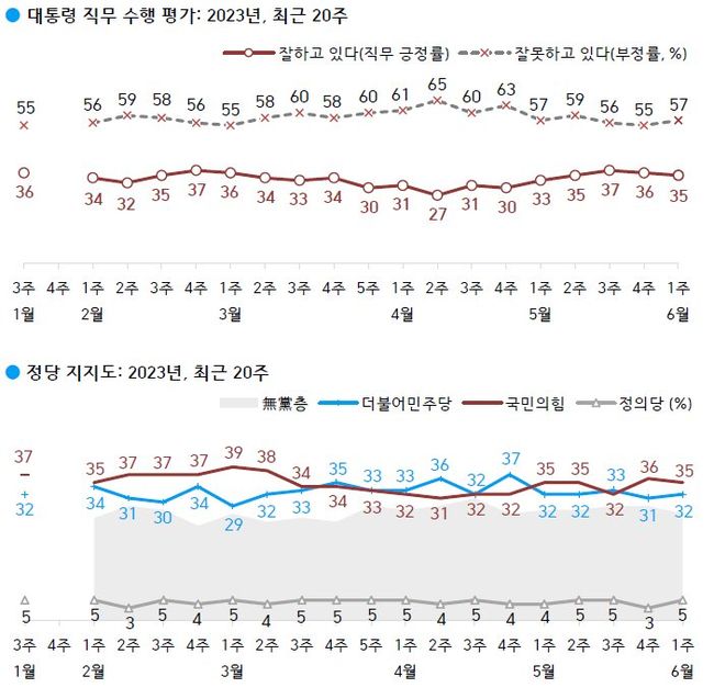 정당 지지율 조사에서는 국민의힘이 전주보다 1%p 내린 35%, 더불어민주당은 1%p 오른 32%로 조사됐다. 정의당은 5%이며 무당층은 27%로 나타났다.