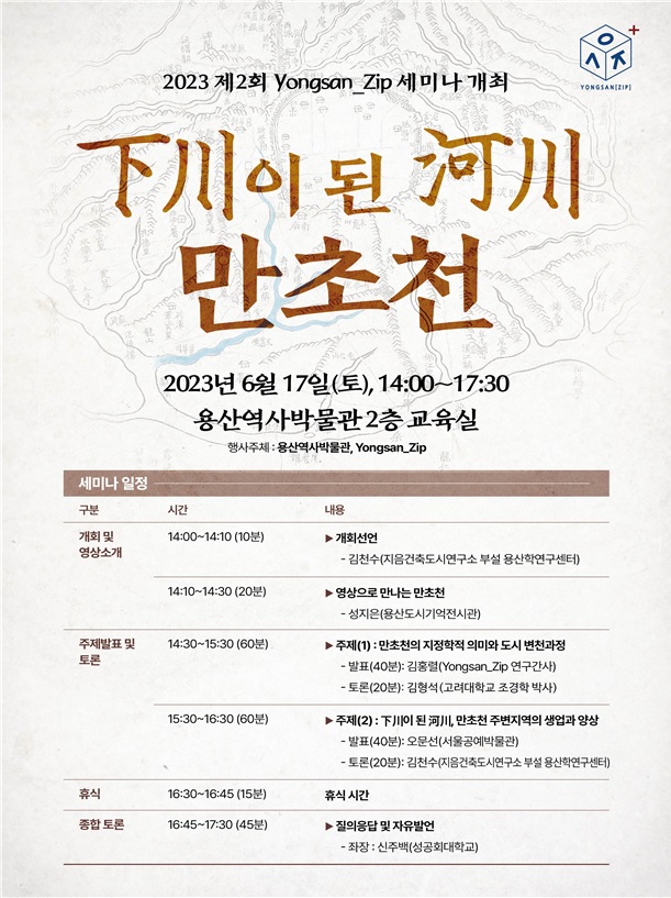 특히 2부에서는 △김홍렬 용산_짚 연구간사 ‘만초천의 지정학적 의미와 도시 변천의 연계성’ △오문선 용산_짚 회원 ‘만초천 주변지역의 생업과 양상’에 대한 주제발표가 진행된다.