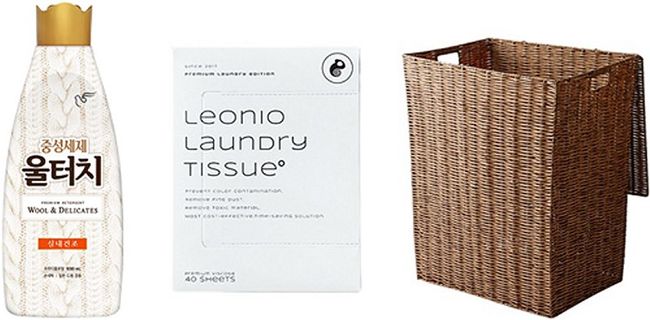 사진 왼쪽부터 피죤 `중성세제 울터치`, 레오니오 `이염방지 시트`, 한샘 `라탄 패턴 사각 햄퍼 빨래함` (사진제공=각사)