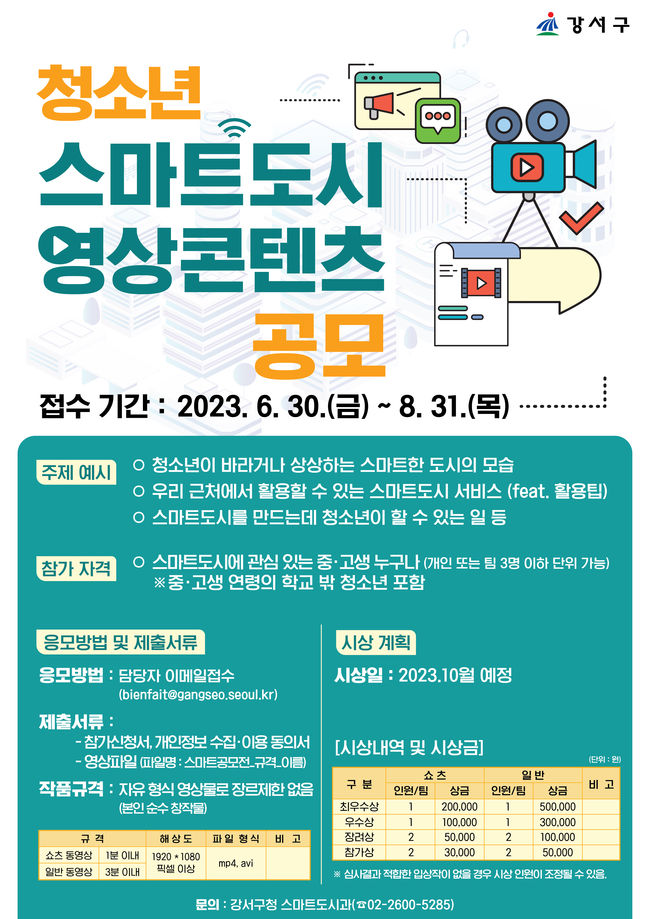 강서구, 청소년 스마트도시 영상 콘텐츠 공모전 - 중고생 누구나 오는 6월 30일부터 8월 31일까지 담당자 이메일로 접수 - 쇼츠 동영상, 일반 동영상 2개 부문 자유 형식의 영상물 제출 - 부문별 최우수상 각 1개 작품 등 총 12개 작품 시상, 수상자에 상장 및 상금