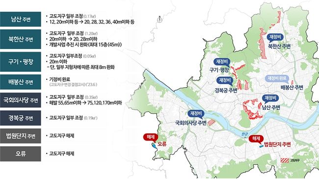 서울시는 ‘신(新) 고도지구 구상(안)’을 통해 남산․경복궁 등과 같이 경관관리가 중요한 지역은 제대로 관리하고 세심하게 살펴 규제를 전체적으로 재정비하며, 그 외 실효성이 적은 지역은 과감히 해제한다는 방침이다.